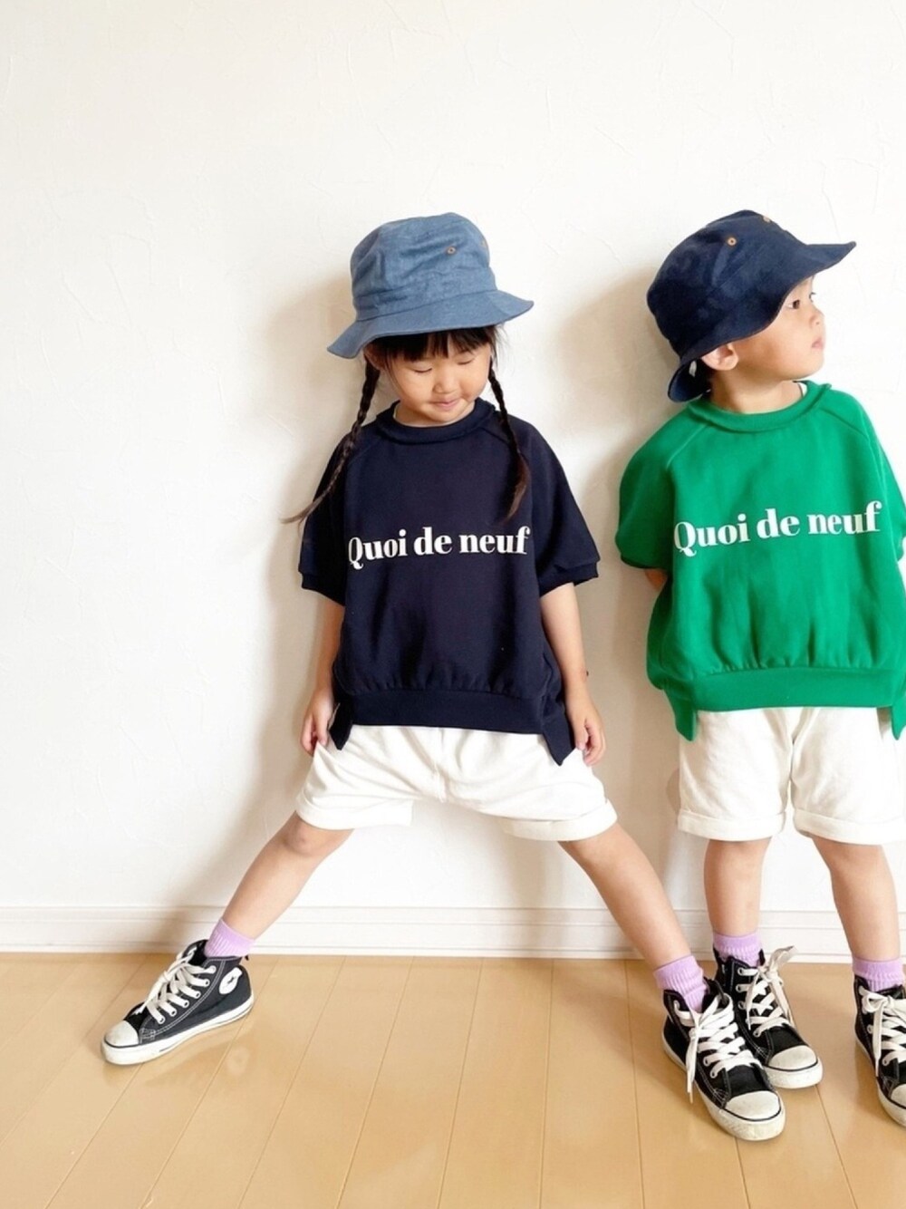 #白パンツ また昨日の🏷 昨年のハーフパンツ。 白だから公園は勇気いるけど スウェット生地が柔らかくて、動きやすいって◎ 半袖ロゴスウェットも 息子にグリーンを追加しました。 パキッとしたグリーンが新鮮! 帽子から靴まで ALLリンクコーデできました。 thank you☺︎☺︎