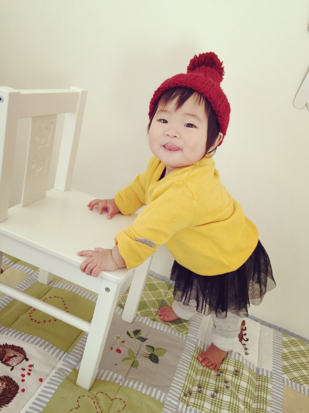 チュールスカート付きのロンパースの重ね着(*^^*) 黄色と赤のニット帽でアクセント♡