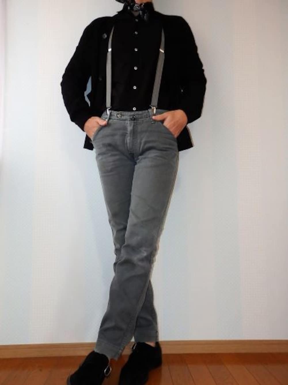 昭和40年代生まれのリアル「おじコーデ」#9 ブラックフライデーにかけて、”THE モノトーン”なコーデ。 H&Mで買い足した首元のスカーフ(バンダナ)とサスペンダーがアクセント。