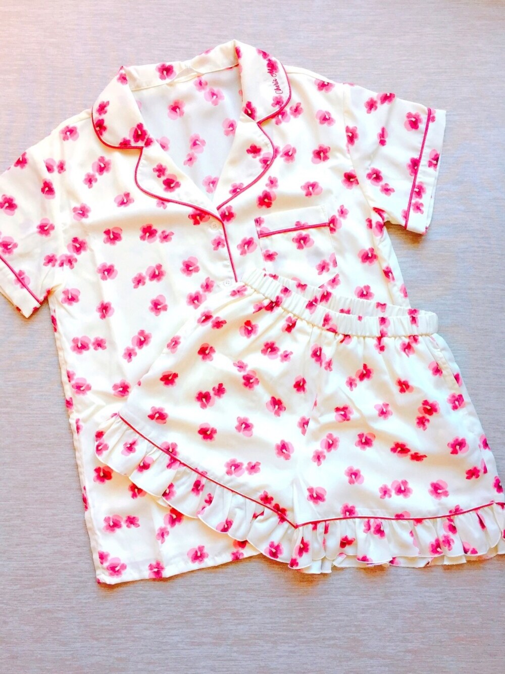 シェリーモナのルームウェアです(´∀`*) アイボリーの生地に大人っぽいピンク色のお花がとっても可愛いです💕 フリルも付いていてとっても可愛くて幸せな気持ちで寝られそうです✨ さらっとした生地で今の季節にぴったりです😍
