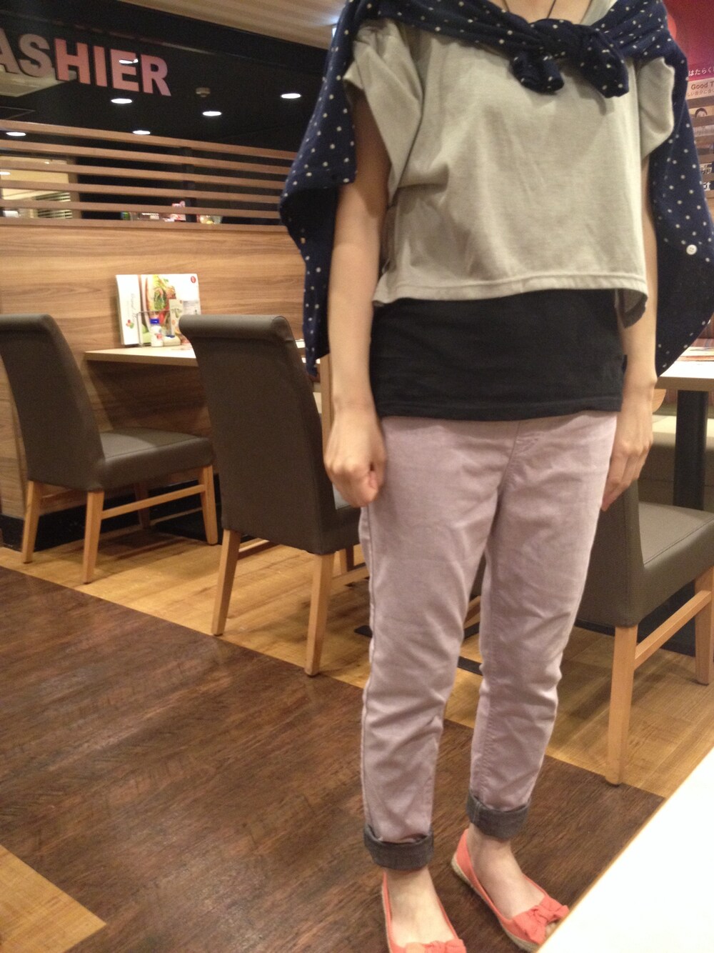 GUのパンツをロールアップしました。 カーディガンはハートマーケット。 インナーはearth music&ecologyです。