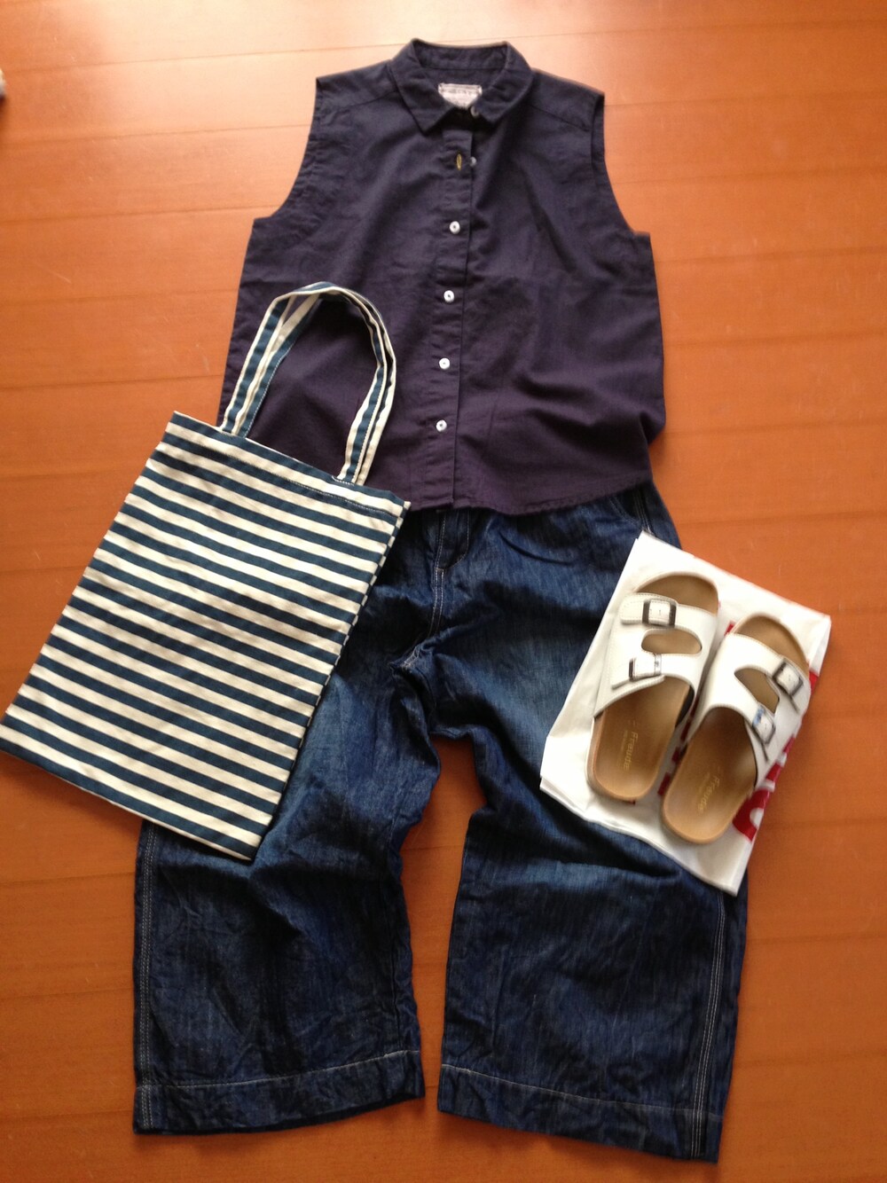 ネイビーコーデかな 安いコーデだぁ ノースリーブのシャツ700円でした。 安い(((o(*゚▽゚*)o)))