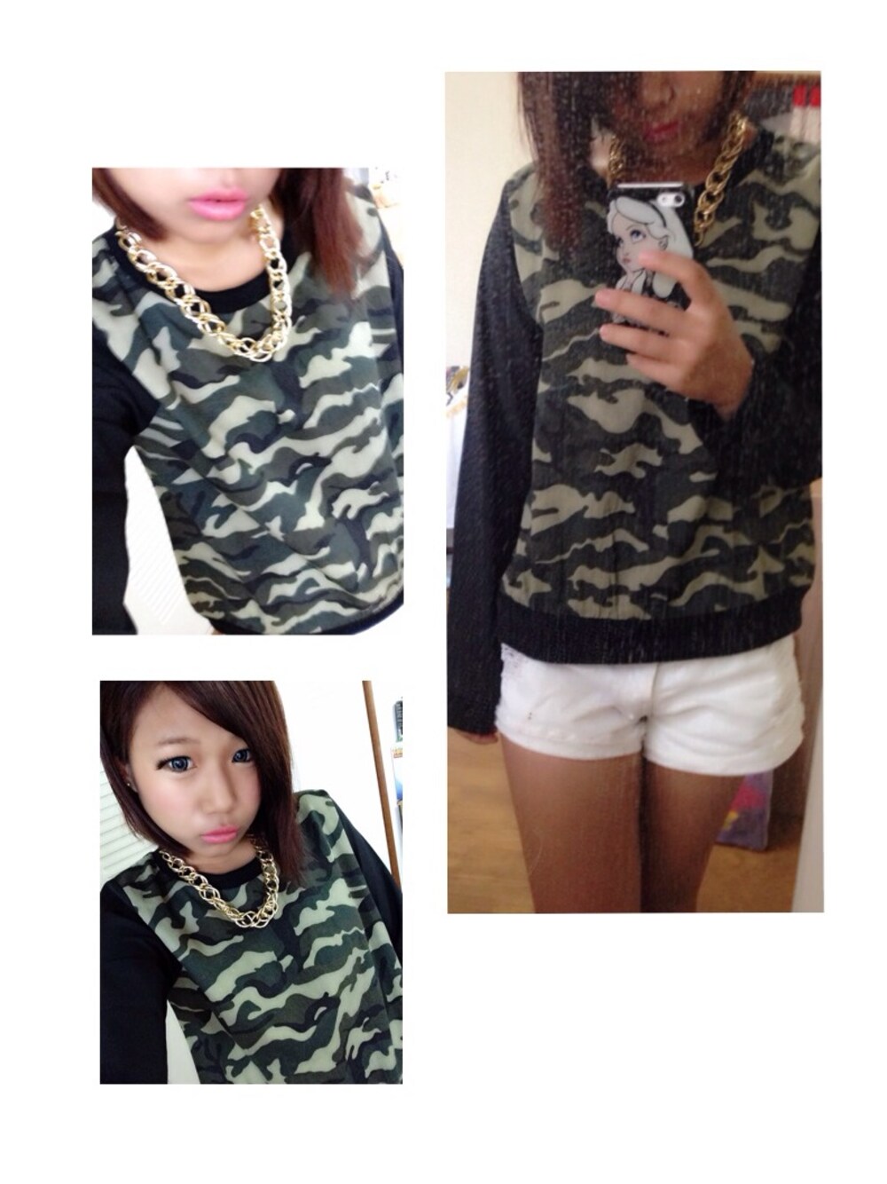おにゅーの迷彩トップに ゴールドアクセはめちゃ合う〜。 ヤンキー風になりたくないから、 白ショーパンではずす。 もうすぐ秋だけどまだまだ白は使えそう♡ アクセはスピンズが安くて使えるからオススメ! 写メにはないけど黒スニーカーもスピンズ。 バイトいってきまーす( ˘ω˘ )👋
