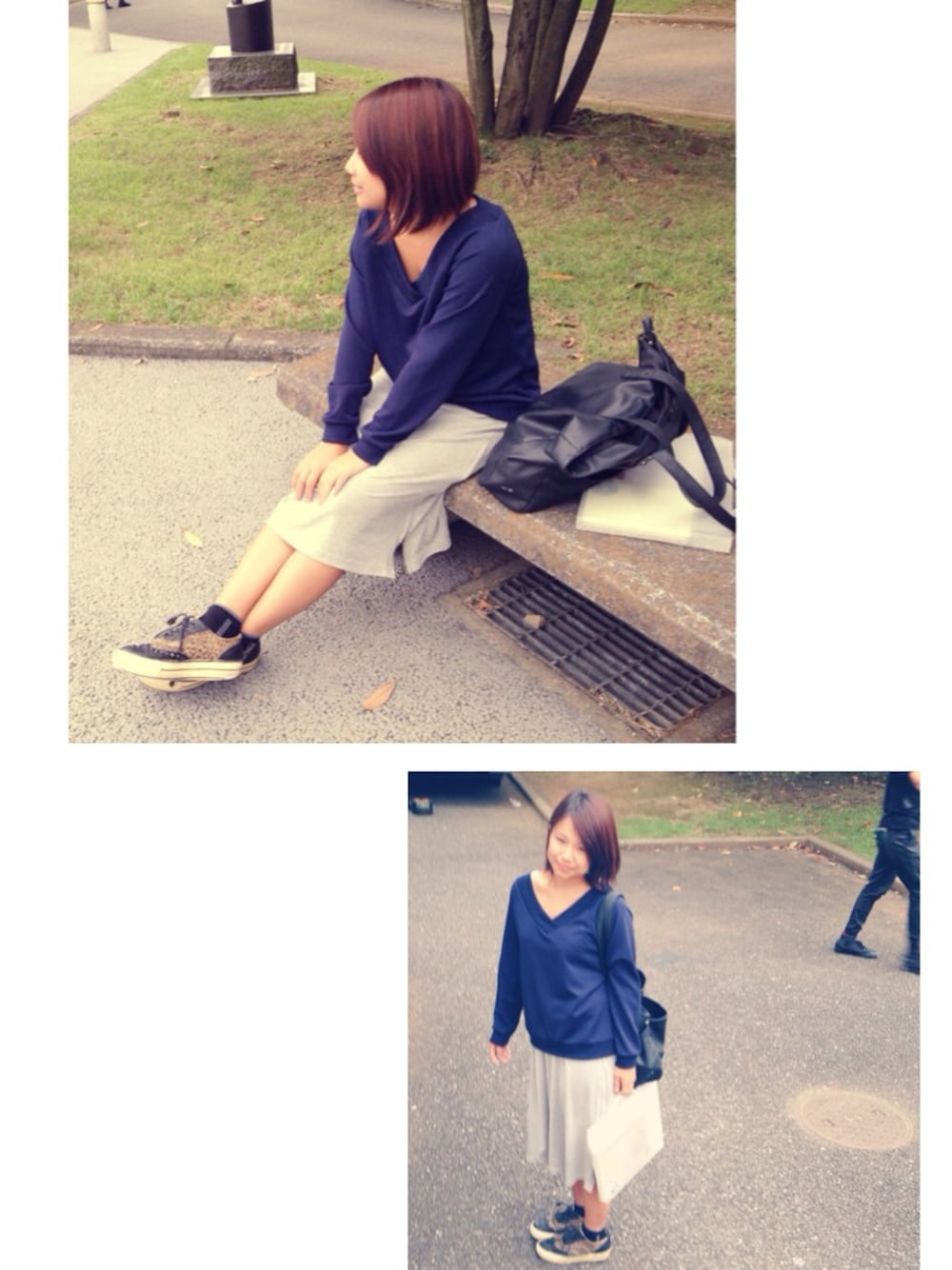 寝坊したからテキトーコーデ(笑) ロングスカートはいまどきっぽく ひざ上まであげてるよ〜。