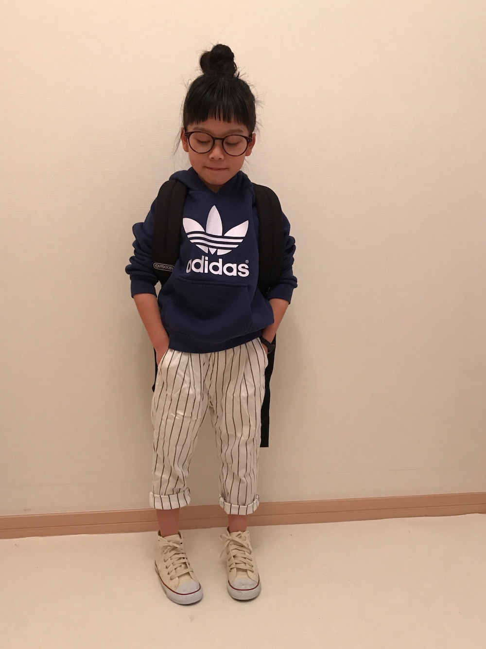 見ていただきありがとうございます^o^ いいね、save、フォローとても嬉しいです❤ 今日はアディダスパーカーの カジュアル春コーデです。 まだ寒いですが、春を意識して、 白のストライプパンツを合わせました✌️