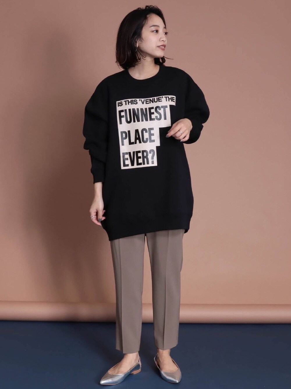 ビッグシルエットのロゴスウェットを主役に、センタープレスのテーパードパンツできちんと感を演出した、大人カジュアルスタイル◎