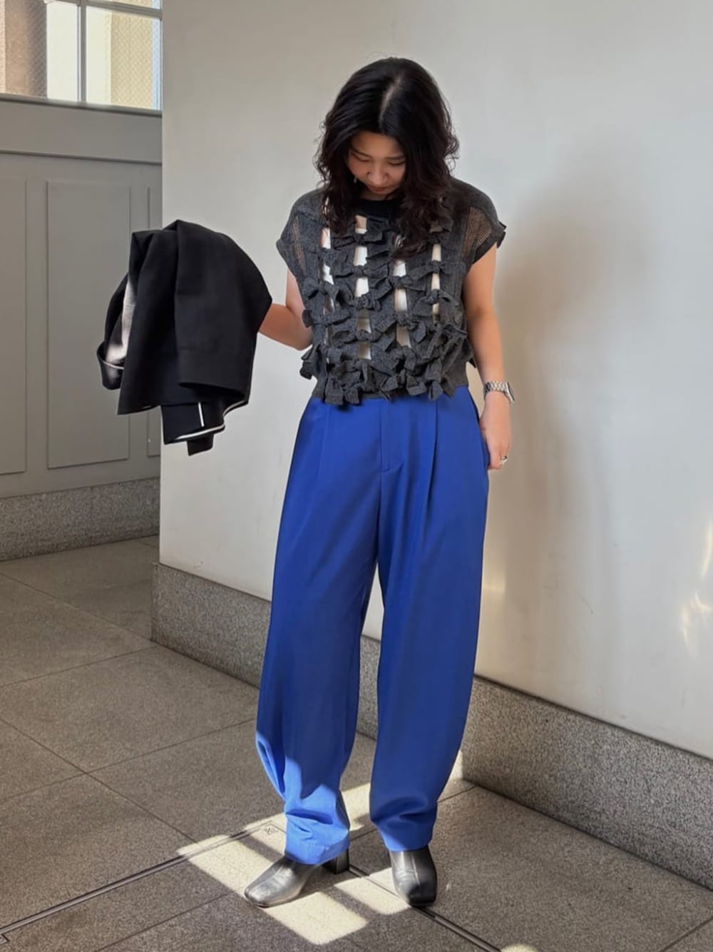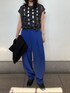 ■knit(black/38) 存在感のあるリボンディテールがアクセント。 柔らかな着心地で、シーズンムードを高めてくれます。 シンプルなボトム合わせでも映える ■pants(blue/38) サイドにボリュームを持たせた立体的なシルエット。 タック入りでラインをきれいに見せ、抜け感のある印象に。 トップスを選ばずバランス良く着こなせる一本。