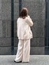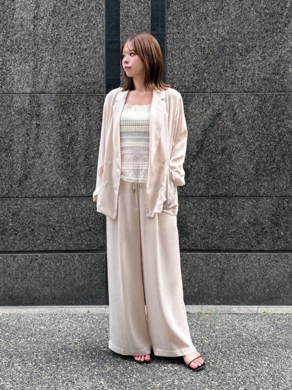 ⚪︎jacket ベルベット風の光沢感のある素材が特徴的なジャケット 柔らかいリラックス感のある着心地で、 セットアップで着てもキレイめになりすぎず取り入れやすいです。 落ち感があるので肩幅も大きく見えずスッキリ見えします ⚪︎cami 3種類の異なる糸を使用した表情豊かなランダムボーダーのキャミソール 所々透け感がありインナー次第でいろんな見せ方が出来ます。 シアートップスなどの上にビスチェ風に合わせるのも◎ ⚪︎pants ジャケットと同素材のリラックスパンツ ウエストは総ゴムでストレスフリーな履き心地。 セットアップはもちろん、 シンプルなデザインでどんなトップスとも相性抜群なので 単品使いにもおすすめです。