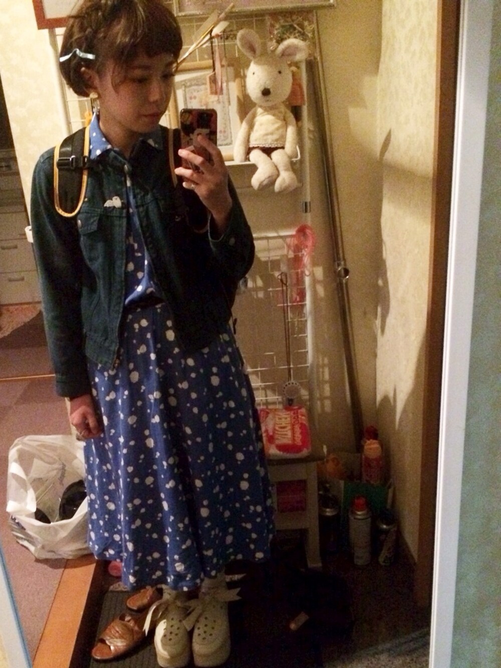 学校👯💫 ☆デニムジャケット petit junko 貰い物 小学校の時から着てる! ☆葉っぱ柄青のワンピース spinns 古着 ☆ブラウジングベルト machupichu ☆バックパック morncreations ☆Bellybutton リボン Tokyobopper 今日は学校に行って、卒業アルバムの写真を撮りにいきました💃✨ もう卒業とかさみしいな〜。 青緑のGジャンに、爽やか青のワンピースの組み合わせを装苑で見て真似してみた! 今回はbopperがリボンなので、リボン付き靴下に、髪の毛にリボンつけました(^ω^)🎀 今日友達のバイクの後ろに乗ってきました! ピューん!ピューん! びゅうううううううううううう(風の音) 顔がブサイクになるくらい風が凄かったんですけど、めちゃめちゃワクワクしました! この時期の風ってすごく気持ちいいですね! 今日は寒かったけど。笑 しかも、今日は月大きくてすごく綺麗! 明日は月が赤くなる日やし楽しみですね〜✨ えあでした〜(^ω^) 明日はライブに行きます♡