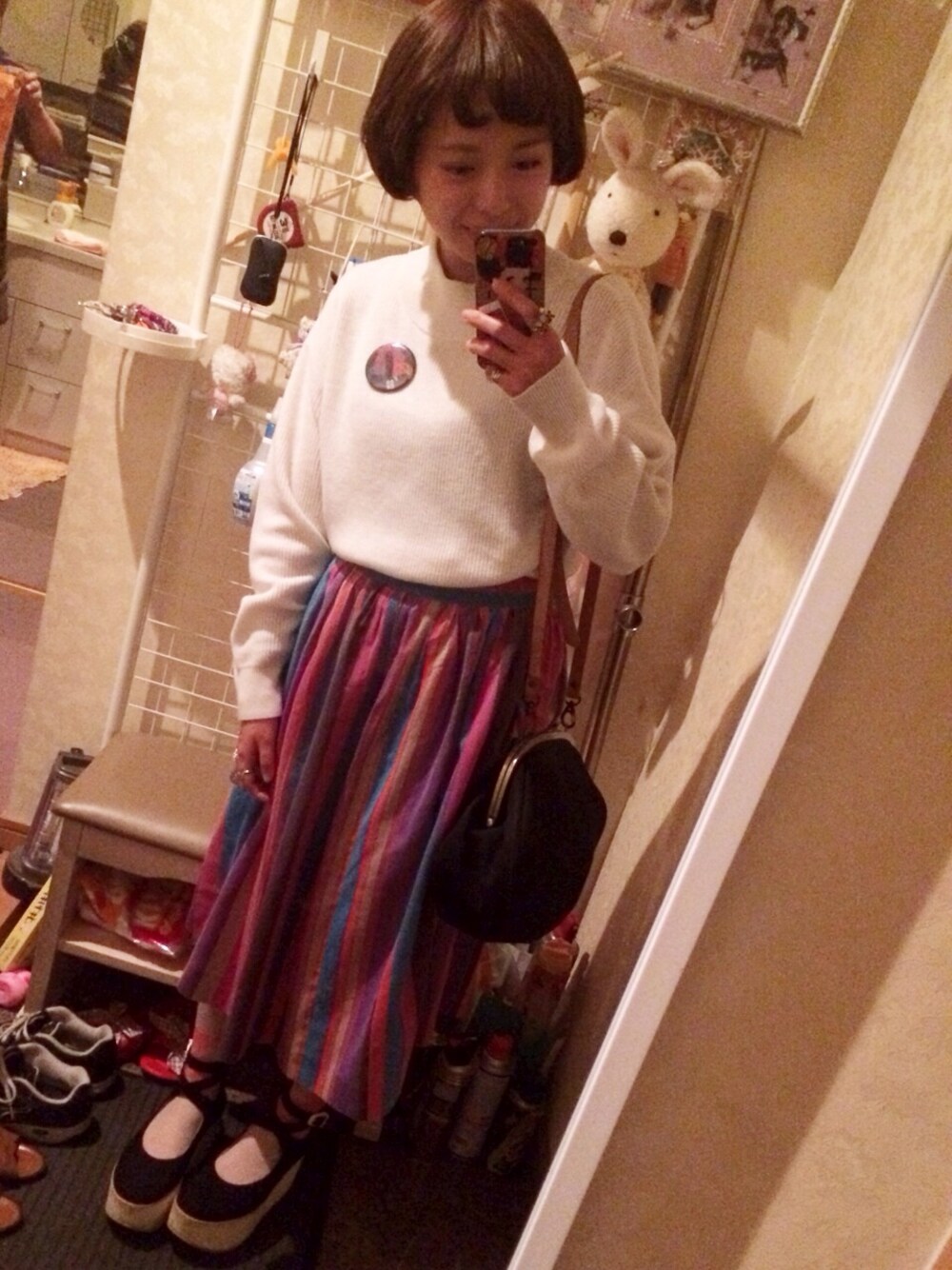 レコード屋さん日和 🎵タートルニット sense of place 🎵カラフルボーダースカート 古着屋cambio 🎵缶バッチ 余命百年の缶バッチ! 🎵タイツ 友達が作ってくれた! シルクスクリーンです 🎵Belly button Tokyobopper 私の大好きなバンド「余命百年」の缶バッチを付けて、無地のセーターに色を👯💫 今日は友達と学校に行った後、レコード屋さん巡りをしました!🏃=3 天気がとても良かったので、とても気持ちが良かったです!スキップしながら歌いたくなりますよね🙋✨ 私、昔のアイドルとかインディーロックらへんがツボなんです! この前はフィンガー5のレコードを見つけて即買い♡飾ってます♡笑 今日はずっと探してたスガシカオの2ndアルバムを見つけて超ハッピー♡ 明日はドライブ🚗 えあでした(^ω^)