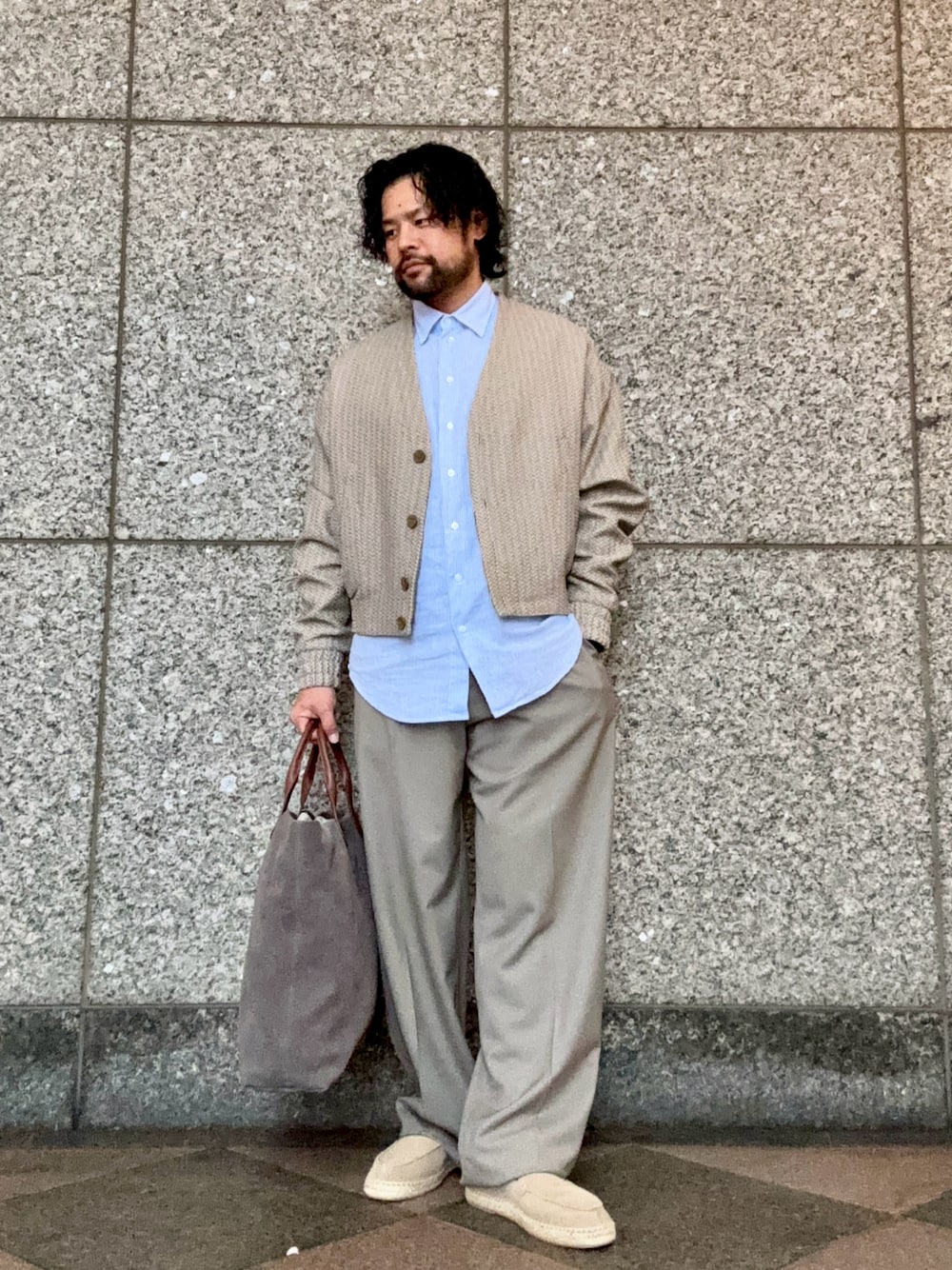上下グレージュでまとめインナーに差し色でブルーのシャツを入れて春らしいコーディネートにしました☘️