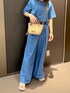 トレンドのデニム風セットアップのコーデです! Tシャツはショート丈でとても合わせやすいです! 楽ちんでとても動きやすく着心地も抜群です🫡 ミニのカゴバックがより夏らしく見せてくれます!