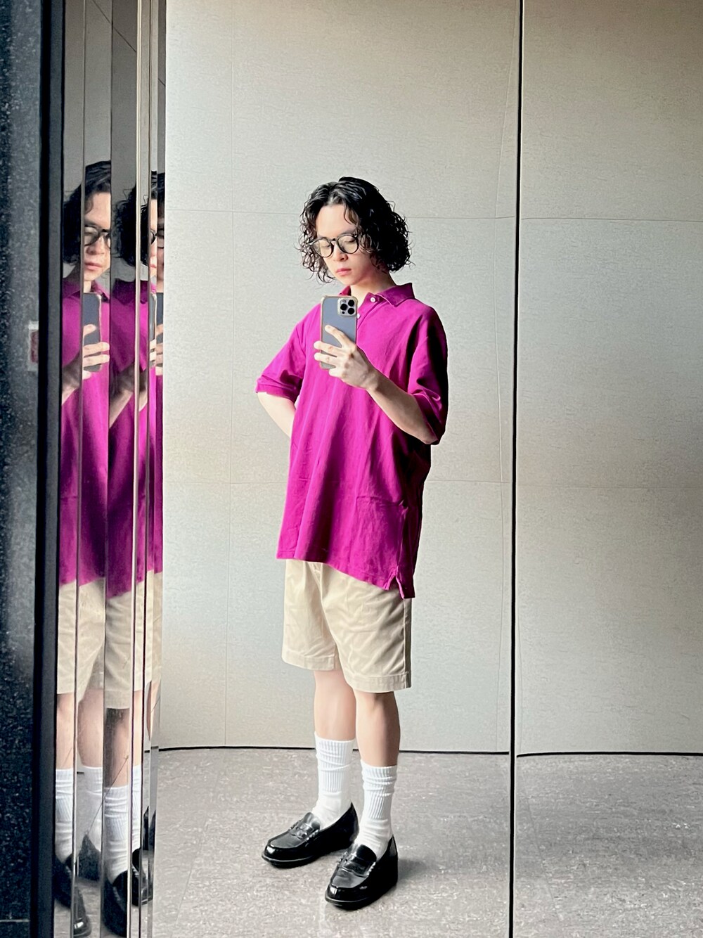 ご覧いただきありがとうございます! 今日は夏と相性いい鮮やかなアイテムを使いたいので、古着屋で買ったのポロシャツを着ました!