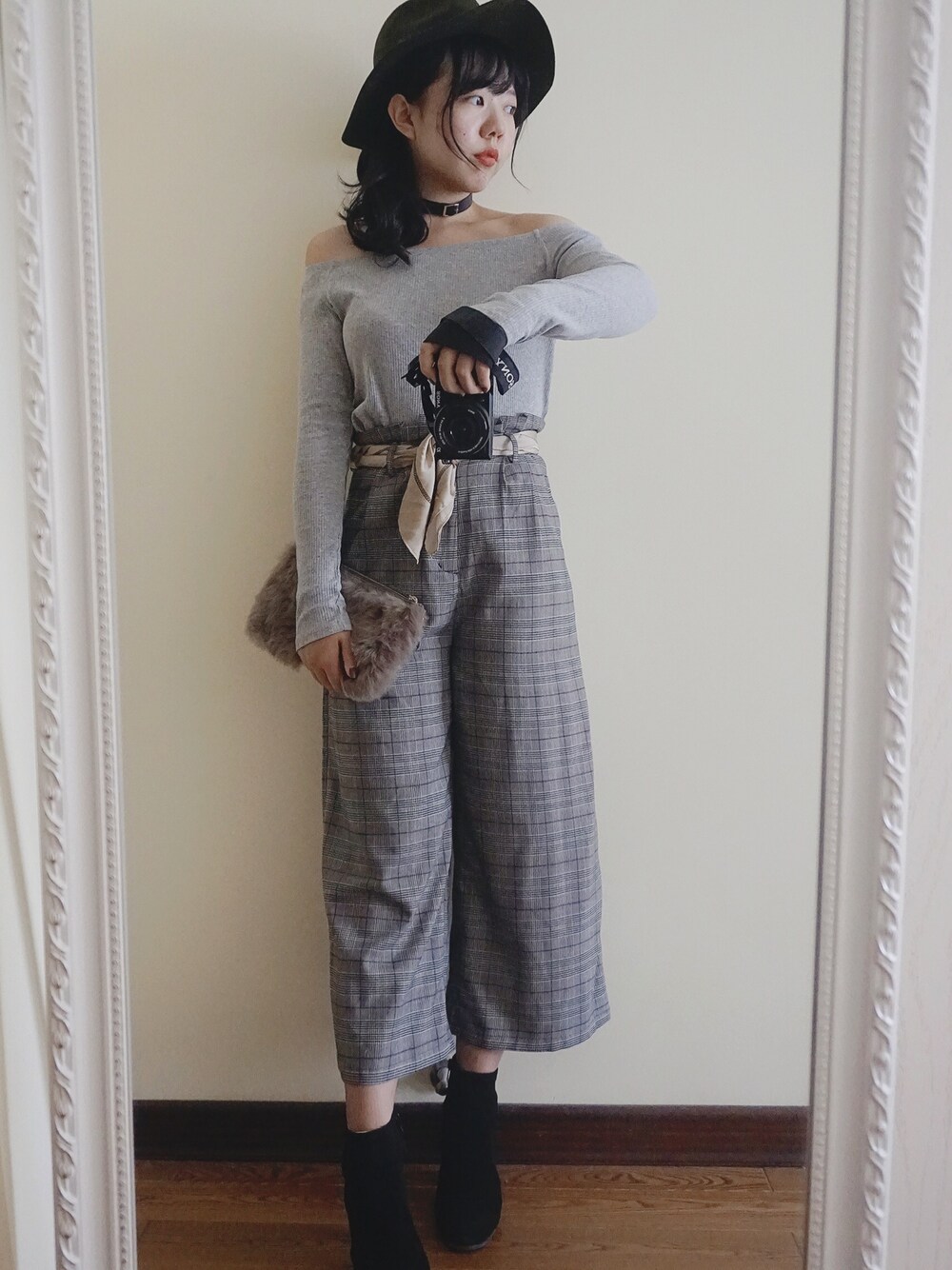 初秋的装扮🤗今年流行的格子元素和一字领的上衣,加一点毛绒感就很秋天啦🍁 如果再冷一点可能还会加个小风衣,也会很酷