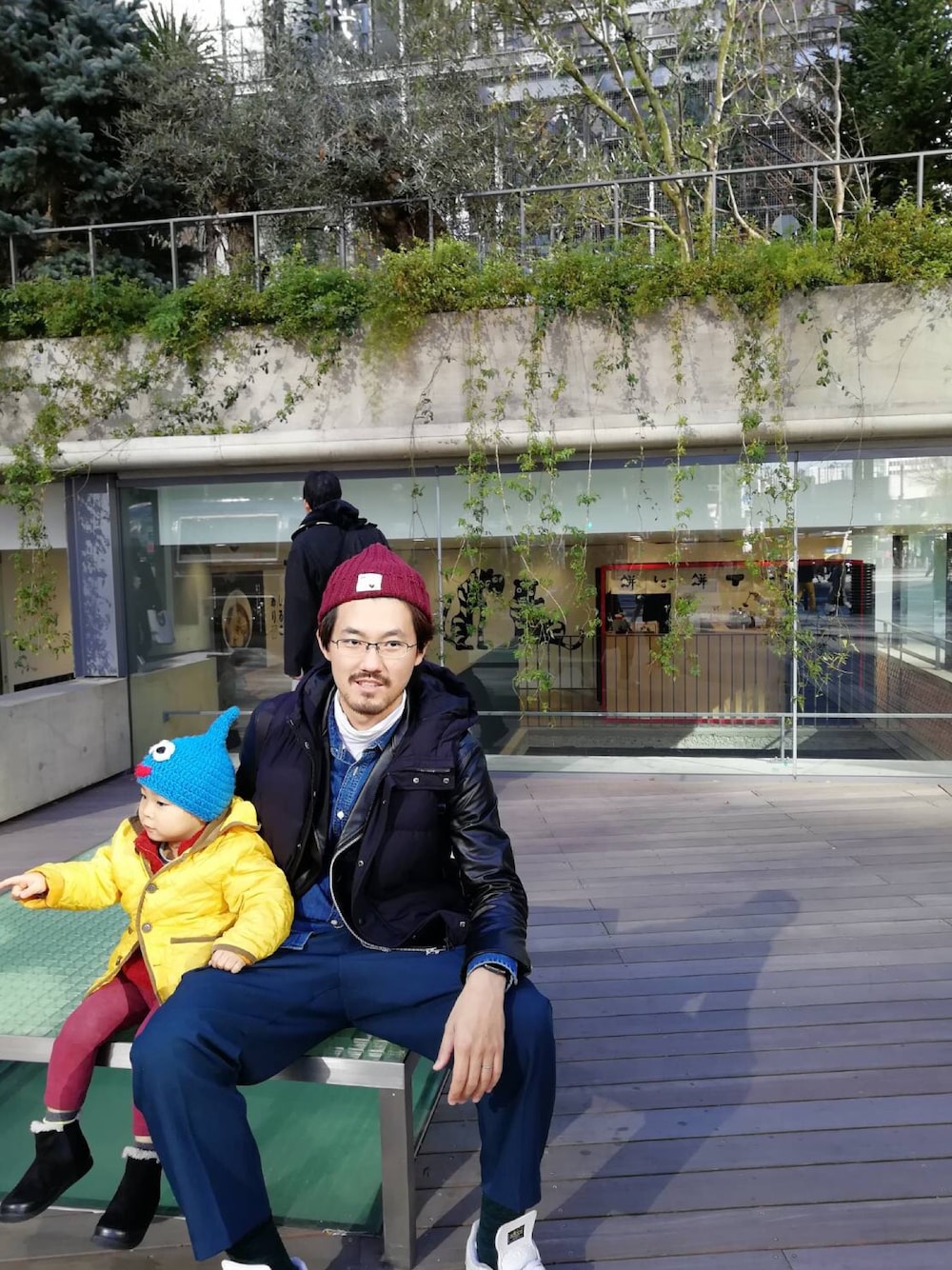 ワイドなボトムスに合わせるのはダブルライダージャケット。 中にヒートテックを着ているとはいえ寒さに備えて、ダウンベストを組み合わせる。 ショート丈のトップスでバランスが取れてる感じ。 休日の子連れ外出はなんだか似たコーデになってる気がするなー笑