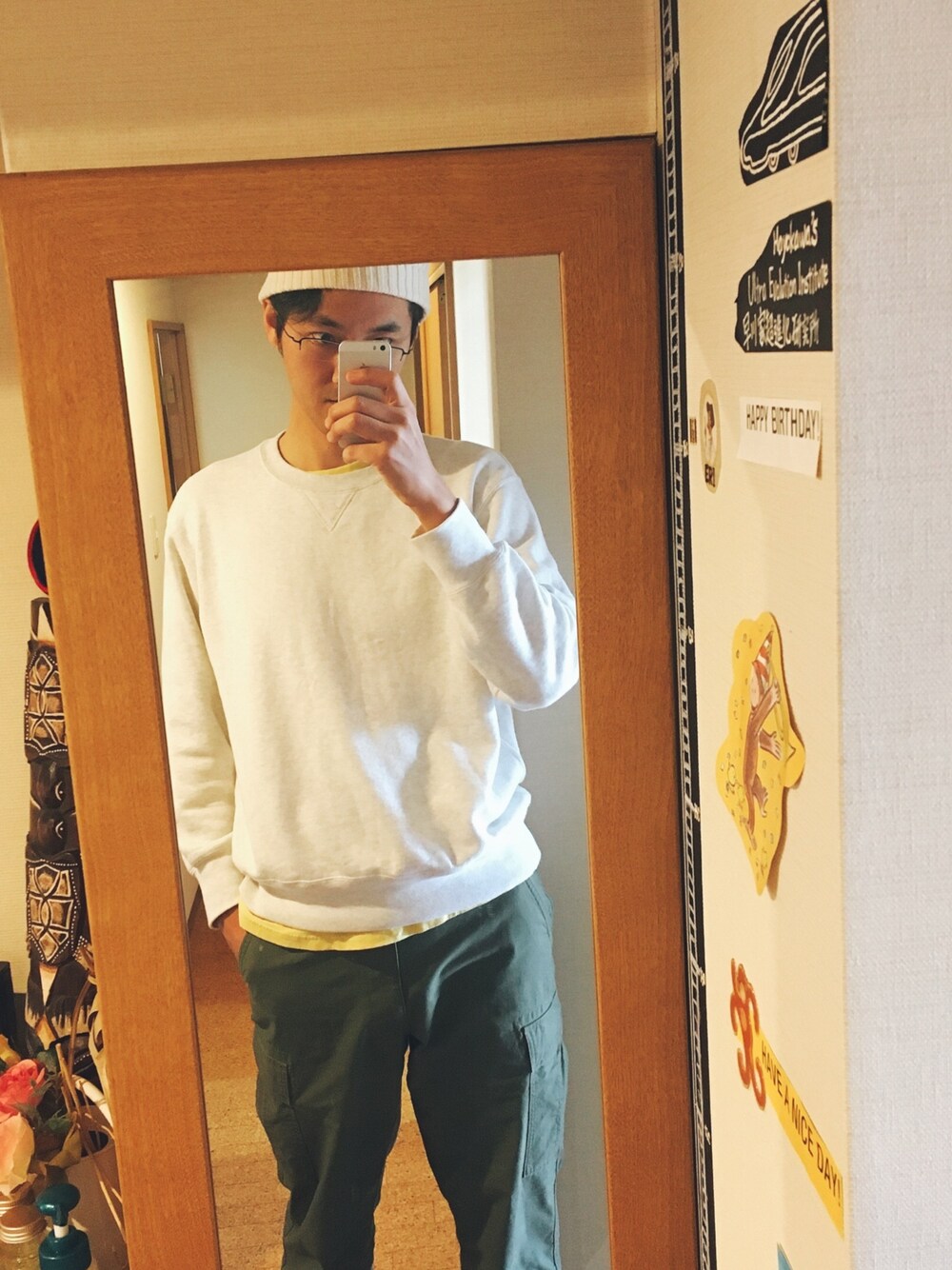 白いスウェットを基調とした春っぽいコーデです。 白いニット帽の使い所が難しかったのも白スウェットと合わせると馴染むかも?