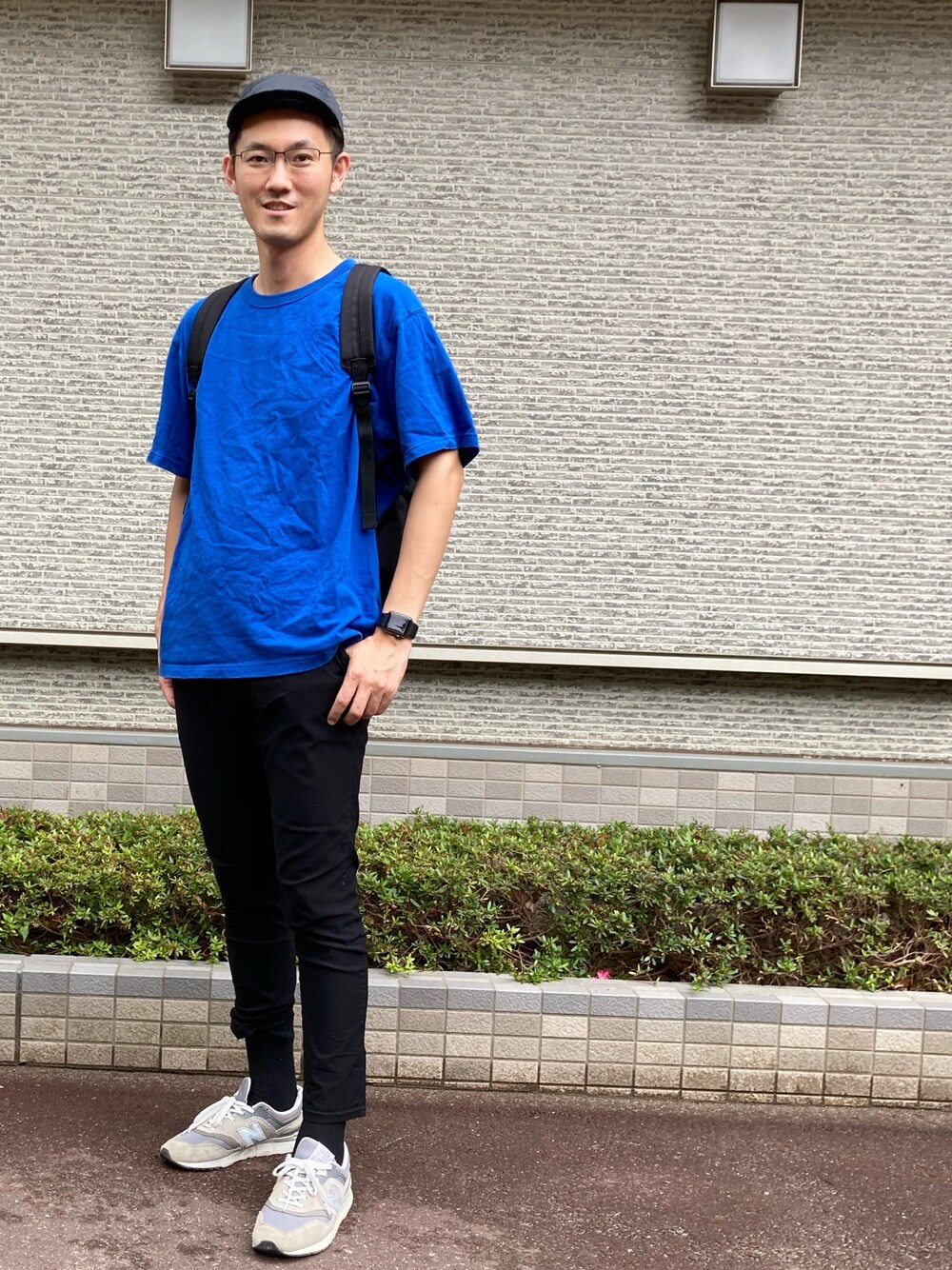 息子に写真を撮ってもらいましたー 息子も好きらしいブルーのクルーネックT