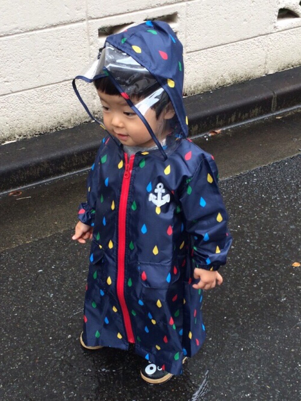 子供の雨用レインコートとレインシューズ。 レインコートはユナイテッドアローズのグリーンレーベル。レインシューズはミキハウスのダブルビー。 雨の日でも楽しめるのが雨の日ファッションですね