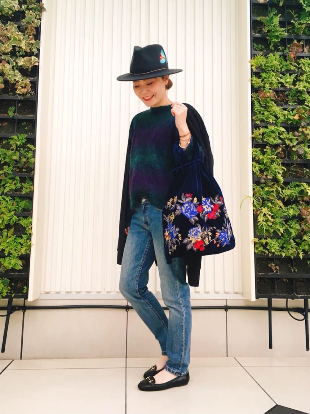 nakamura(155cm) 巾着バッグのコーディネートです。 バッグの刺繍とハットの刺繍を合わせて。 instagram→@naonaka.3