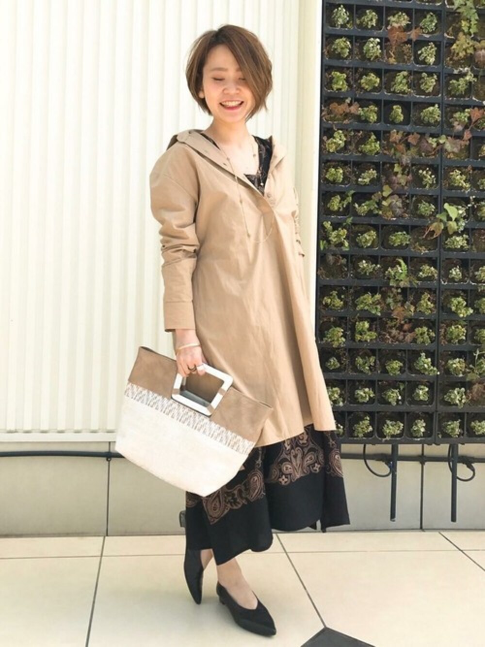 ワンピースのブラックを差し色にした大人カジュアルコーデ。 ベージュでトーンを揃えてエスニック感を抑えめに着るのがポイントです。 柄のアイテムをインナーにするとコーディネートの幅が広がりますね。 アクセサリーはマットゴールドやウッド素材でナチュラル感を。
