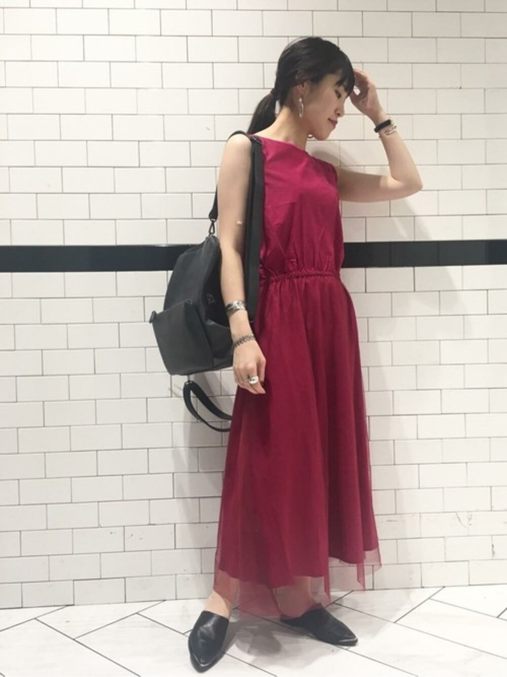 鮮やかなカラーが目を引くチュールワンピは、普段からリゾートまで着まわせるアイテムです。 ウエストゴムは締め付けがないので、楽ちん。 そして脇の開きがないので、インナーを気にせず一枚で着れるのも夏最高です。 ロング丈のワンピースなので、リュックとの相性もばっちり。 これだけシンプルなリュックだと、カジュアルすぎず大人っぽく持てます★ (身長158cm)