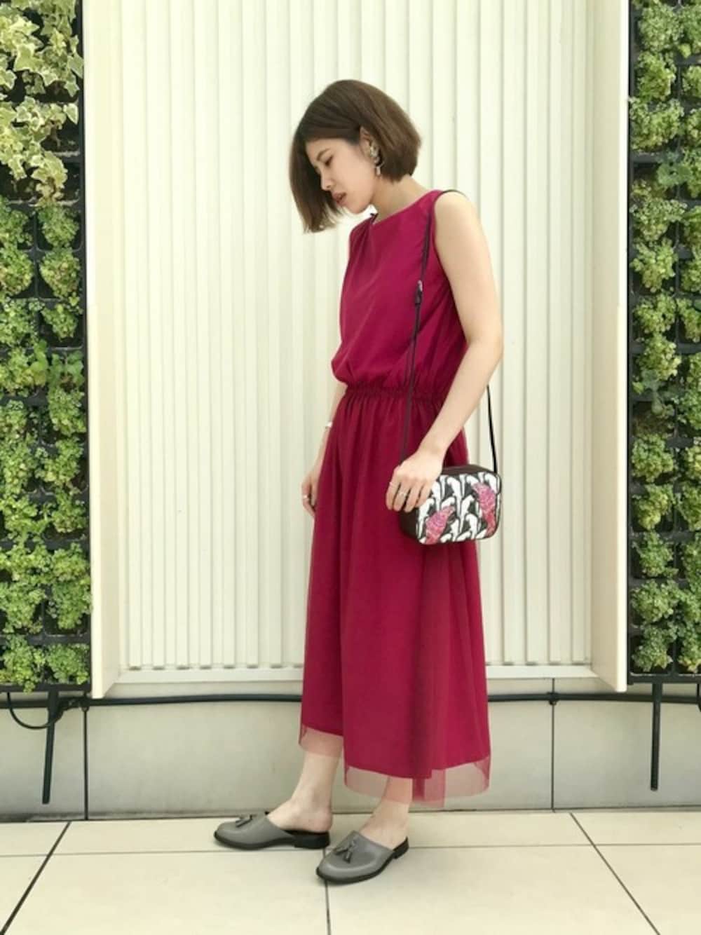 身長167cm 大人ピンクコーディネート。 ピンクのチュールワンピースにエレガントな小物を合わせて甘くなりすぎないようにしました♪ 服がシンプルなので、バッグは個性的に。