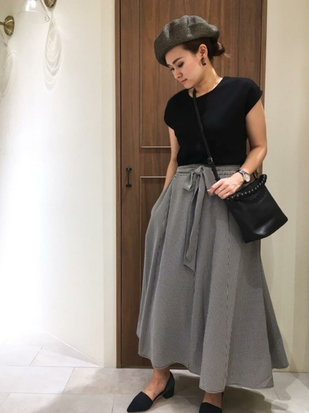 スカートのチェック柄がポイントのモノトーン女子スタイル カッコよくなり過ぎないように あえてスカートで女子らしさを演出 あとは小物で個性をプラスすれば、 甘くなり過ぎないモノトーン女子スタイルの完成です!