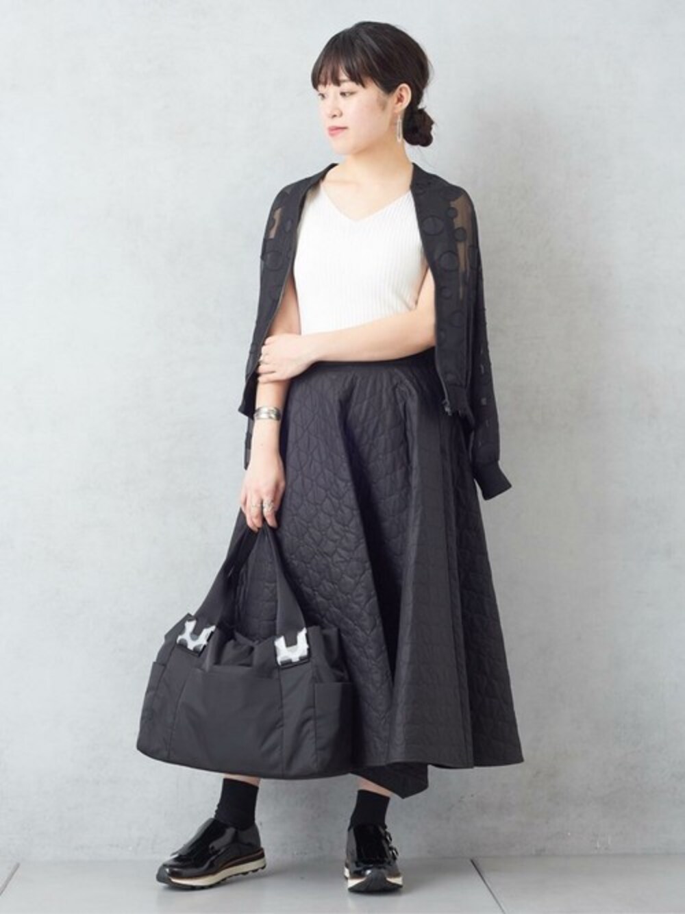 モノトーンでシンプルにコーデ。 ポイントはドット柄合わせ。 ブラックでもドットで華やかさがでます★