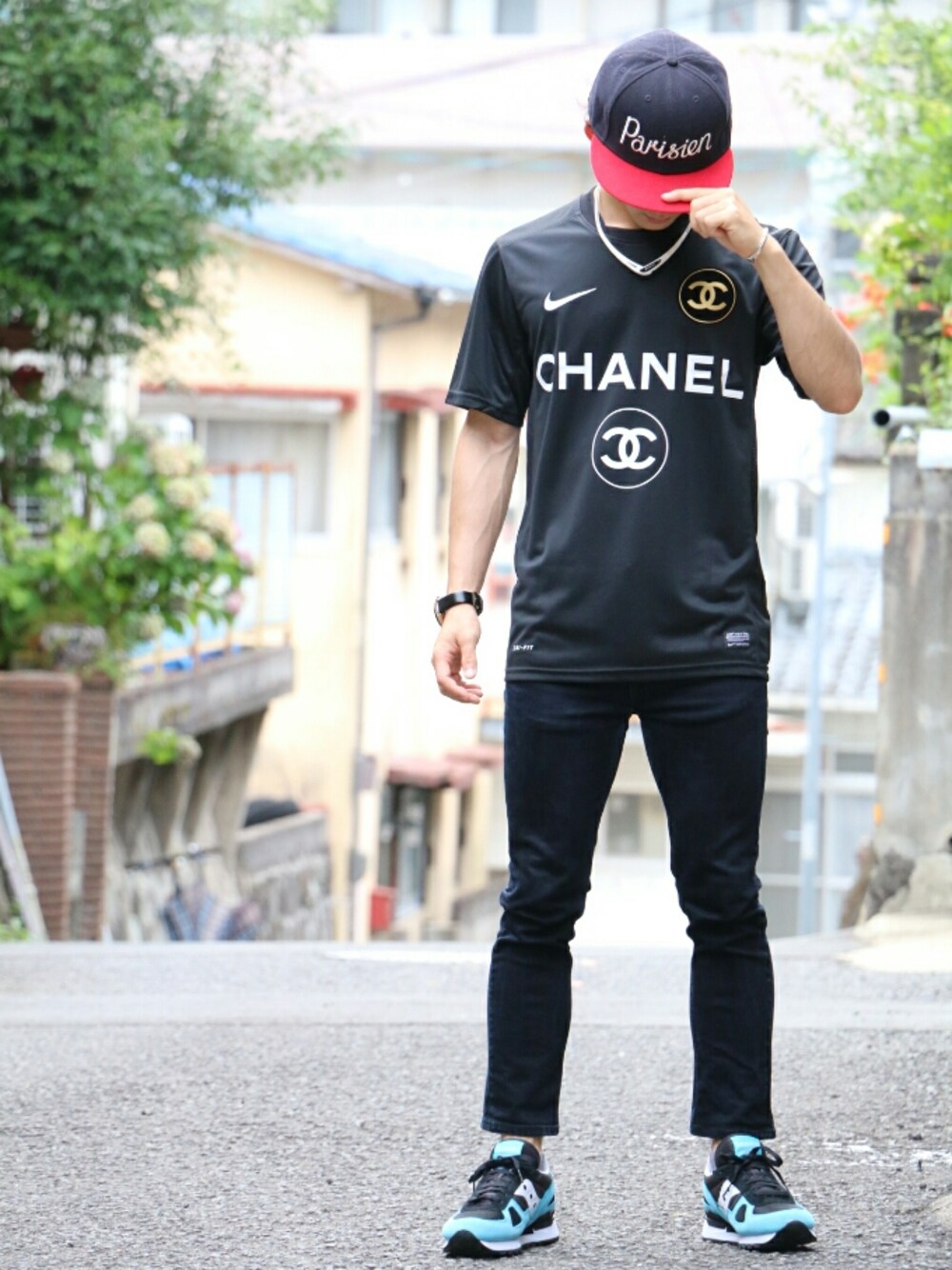「スポーティーストリートコーデ」 今日はEVANESCE BOUTIQUEのNIKE、CHANELパロディシャツを着てみました🐳🐳 このシャツはかなり偽物が出回ってるんで、国内正規販売を行ってるお店のものを買いました💸💸 あと、おろしたてのサッカニーを履いてみました❗❗ こちらの商品は使いやすいデザインで、しかも今、かなり安くなってるんでオススメです👌 たまには●で顔を隠さない写真を撮ってみようと、一念発起してみました笑😅 そのせいで厨二病っぽくなってしまいましたが、大目に見てください👀👀💦 では✋