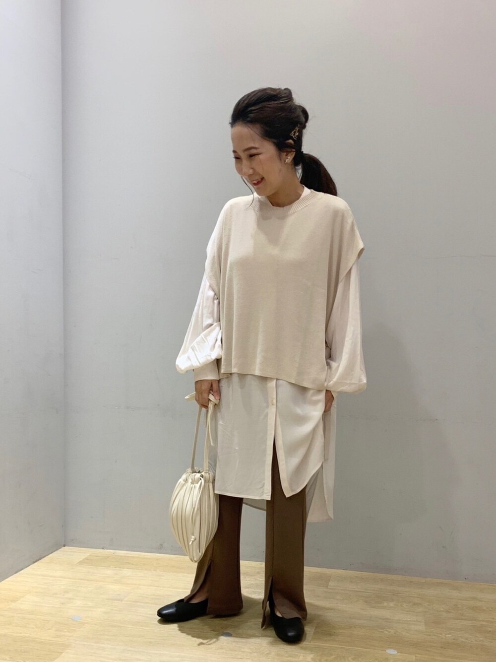 モカ色パンツの着まわし☺️ この秋、アース一推しの イージーケアシャツとベストの レイヤードスタイル🍂