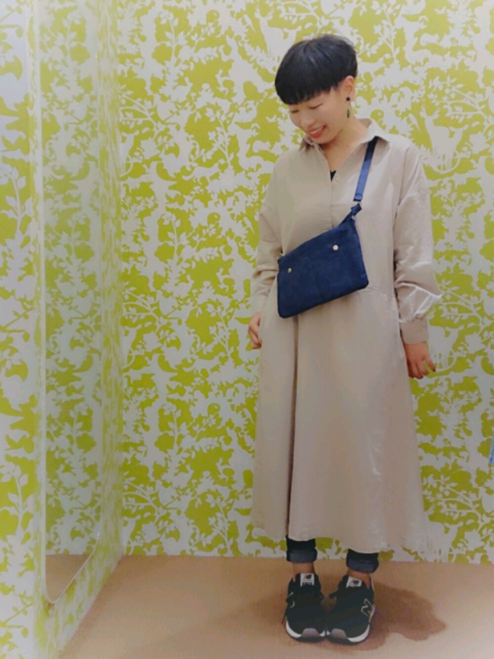ナチュラルな雰囲気のワークシャツワンピースにデニムスキニーを合わせたコーデ💡👜サコッシュの斜め掛け位置の正解がいまいち分からず苦笑いしてるところです😋💦おしゃれは研究ですね!🍀