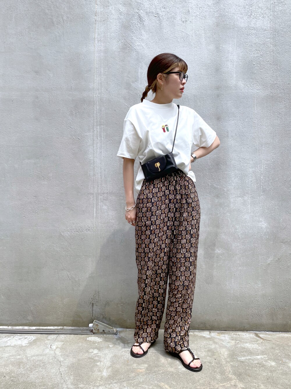 今年はTシャツハマりそう。。 デニムもいいけど柄パンでひと癖出すのもおすすめ◎ 小物はブラックで引き締めて。