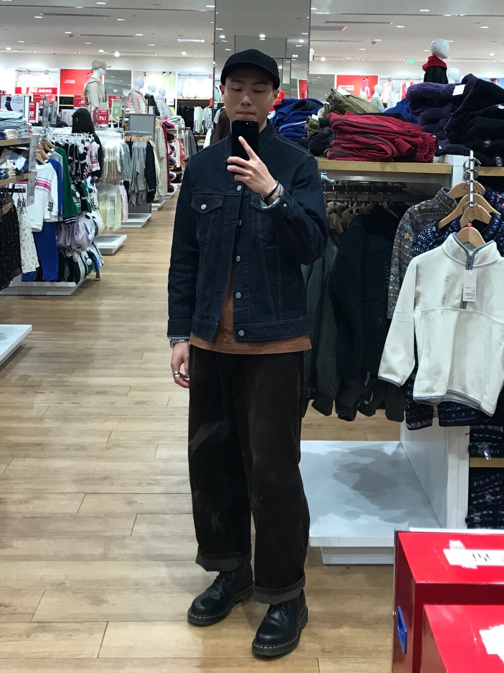 ブラック系のデニムジャケットを着用したメンズの冬コーディネートの1枚目の写真