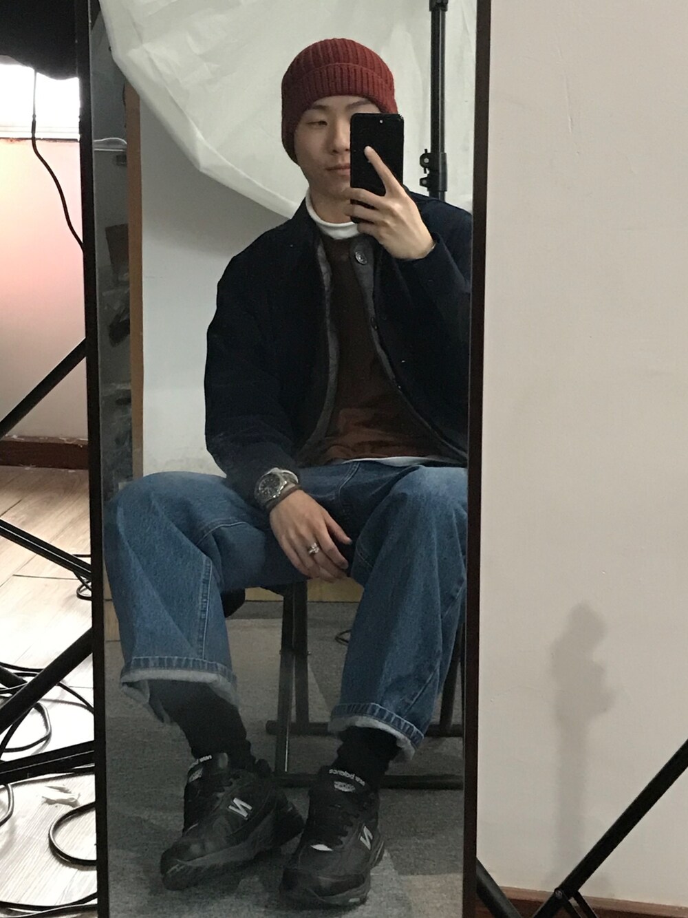 ブラック系のスニーカーを着用したメンズの春コーディネートの1枚目の写真