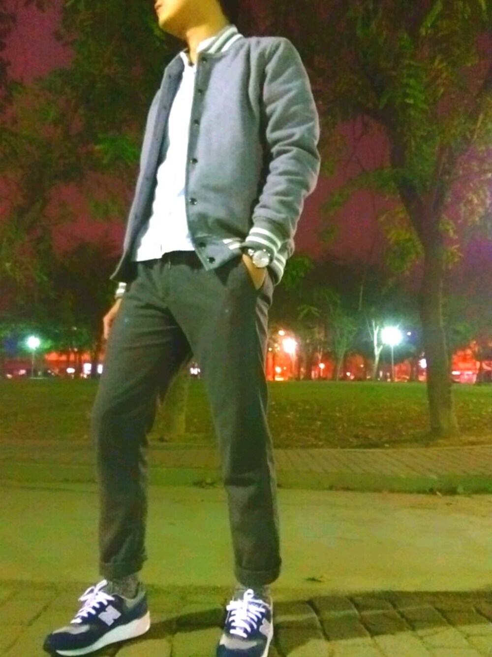 グレー系のその他パンツ、ブルー系のスニーカーを着用したメンズの冬コーディネートの1枚目の写真