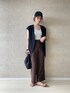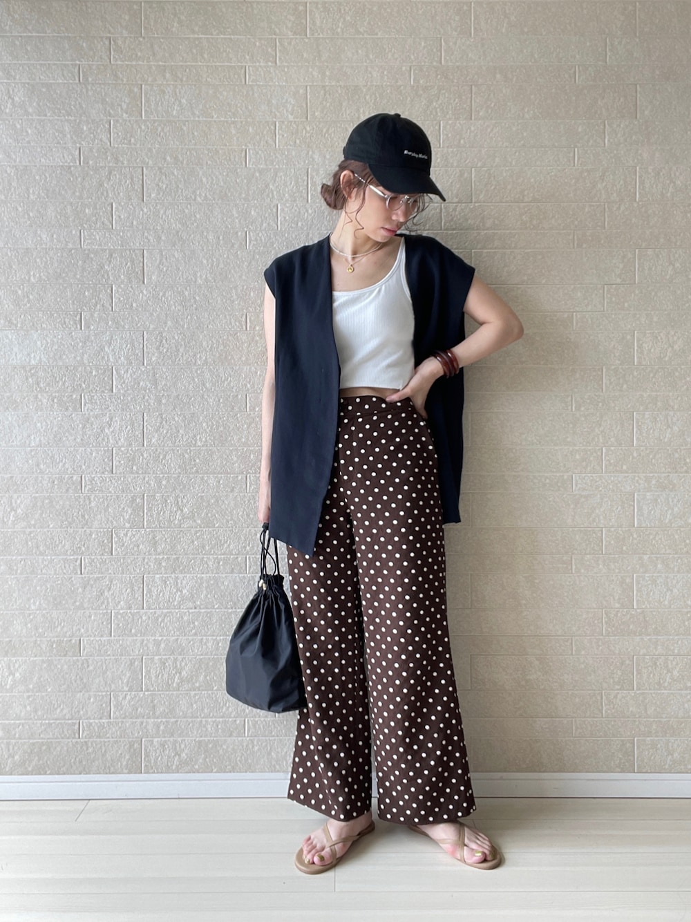 ドットパンツの大人カジュアルな着こなし①✏︎ ・ハイウエストのセミワイドパンツは短めトップスと相性◎ベストをレイヤードすれば肌見せも抵抗なくヘルシーに季節感とトレンド感が楽しめます✔︎ ・色数を抑えてドット柄を大人っぽく仕上げてみました。どことなくレトロな雰囲気がツボです*