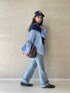 淡いブルーのワントーンコーデ✏︎ この時期はビッグシルエットのシャツとデニムがベーシックなスタイルに*今回はバッグと靴をレザーにしてきれいめカジュアル。 ハイウエストなので腰まわりはぐっと引き締まった印象、膝下から広がっているデザインなので、トップスにボリュームが出ていくこれからの時期、フレアデニムはメリハリのある足元作りに最適◎