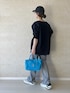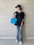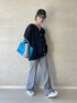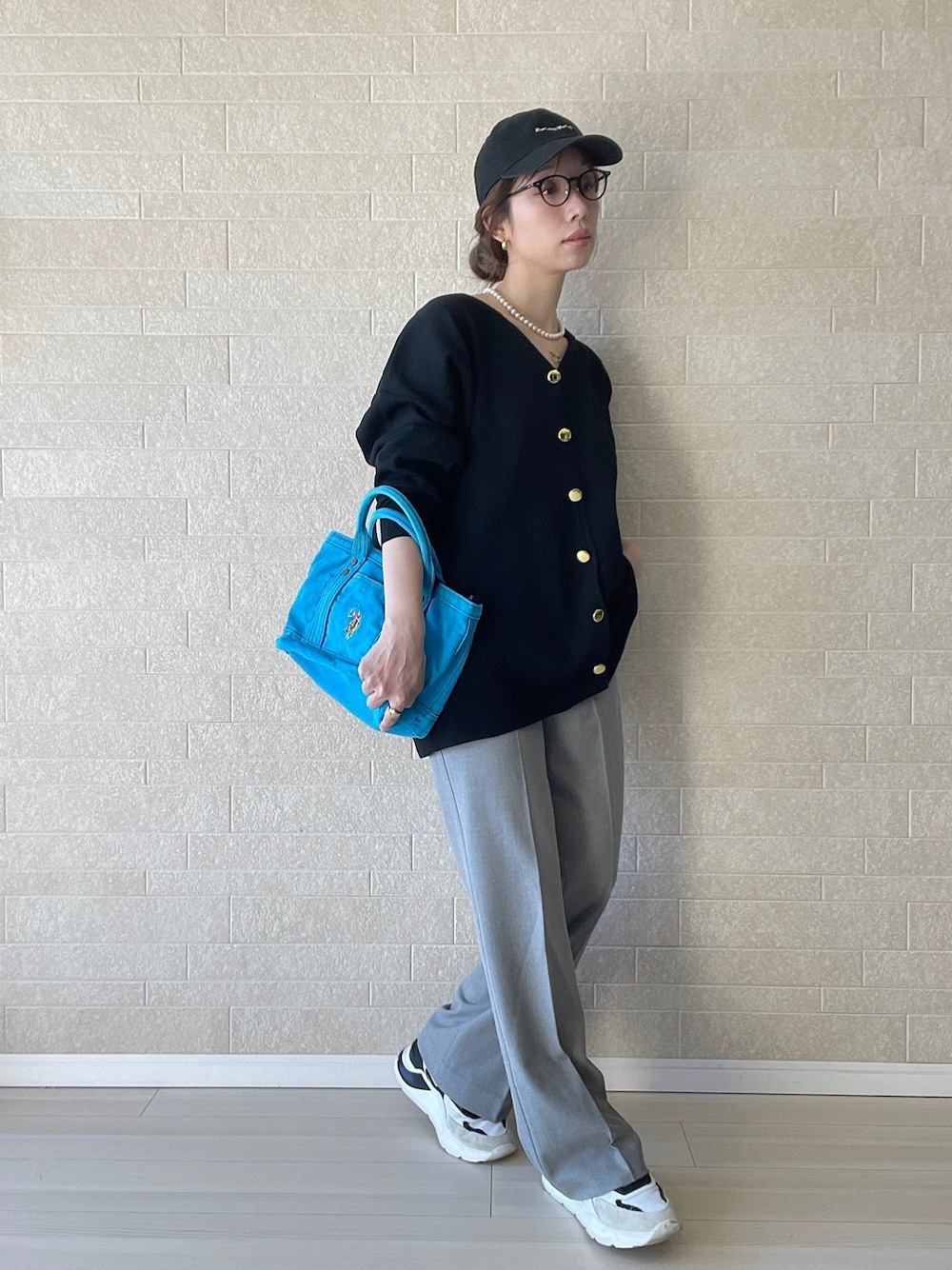 定番スラックスで大人のきれいめカジュアル✏︎ 【キャップ×パールネックレス】 【金ボタンカーデ×ダッドスニーカー】 きれいめ×カジュアル、相反するテイストの掛け合わせが好きです。 寒色系ビビットカラーのトートはシンプルなモノトーンほど引き立ちます✔︎くったりした雰囲気ががんばりすぎない大人カジュアルにピッタリ◎チャック付きで実用性も高いです◎