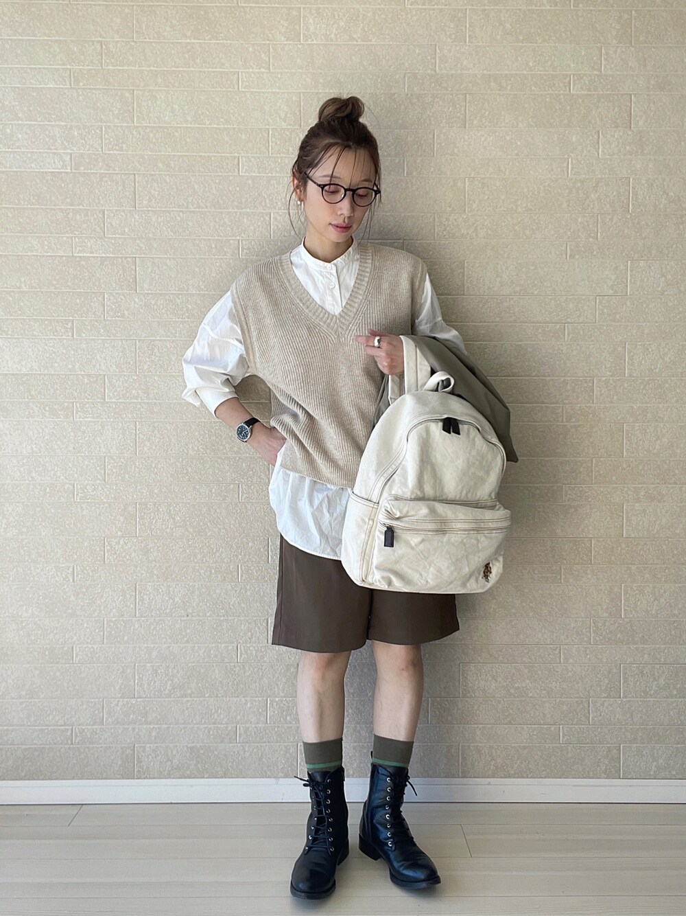 淡色ワントーントラッドスタイル✏︎ リュックのやわらかい雰囲気に合わせて春っぽくベージュ系にまとめました* 🎒…抜け感のある色とナチュラルな素材で、たっぷり収納力はあるのに圧迫感のない見た目◎内側やサイドについたポケットも実用的でマザーズバッグや通学にもおすすめ。