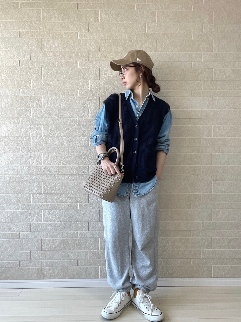 シーズンレスなレイヤードスタイル✏︎ 何を着たらいいのか、肌寒かったり暑かったりのこの時期やっぱり頼りになるのはベスト◎定番の着回しアイテムばかりなので靴下やメガネなどの小物で変化をつけてます。 最近バッグを肩からかけるショルダースタイルが私の中できてます✔︎本日はスタッズ付きの一見攻めのバッグですが、長めに肩からかけて脇にラフに持つとカゴバッグのような可愛いらしい印象に*