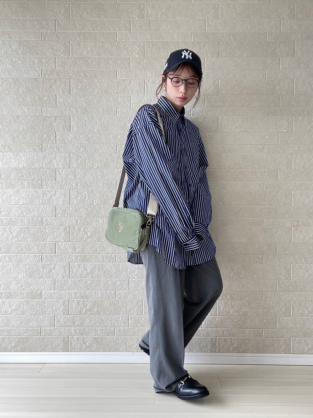 きれいめメンズライク✏︎ 〼本日も黒小物でキリッと。ダークトーンでまとめても縦縞は動きがあるしクリーンな雰囲気が出しやすい。 〼ワードローブが寒色系やモノトーンな方におすすめしたいカーキ色バッグ。 ヴィンテージライクな風合いで差し色に使いやすく、ベルトを外してクラッチにも◎スリムサイズなので小旅行や荷物多い日のバッグinバッグにも使えます*