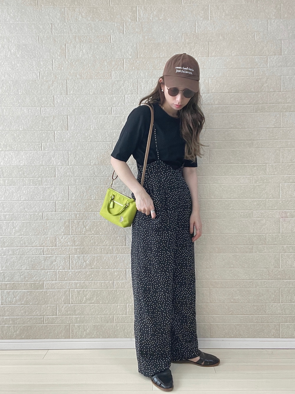 きれいめカジュアルに大人サロペ✏︎ ▶︎ドット柄はワントーンでまとめて大人っぽく。穿いてると、どこのですかとよく聞かれるサロペはシルエットがたまらなく可愛いです🫰 ▶︎モノトーンにちょこっと添えたピスタチオグリーンが垢抜けポイント。レザー調のショルダーベルトとナイロンのコンビが高級感増し増しです✔︎