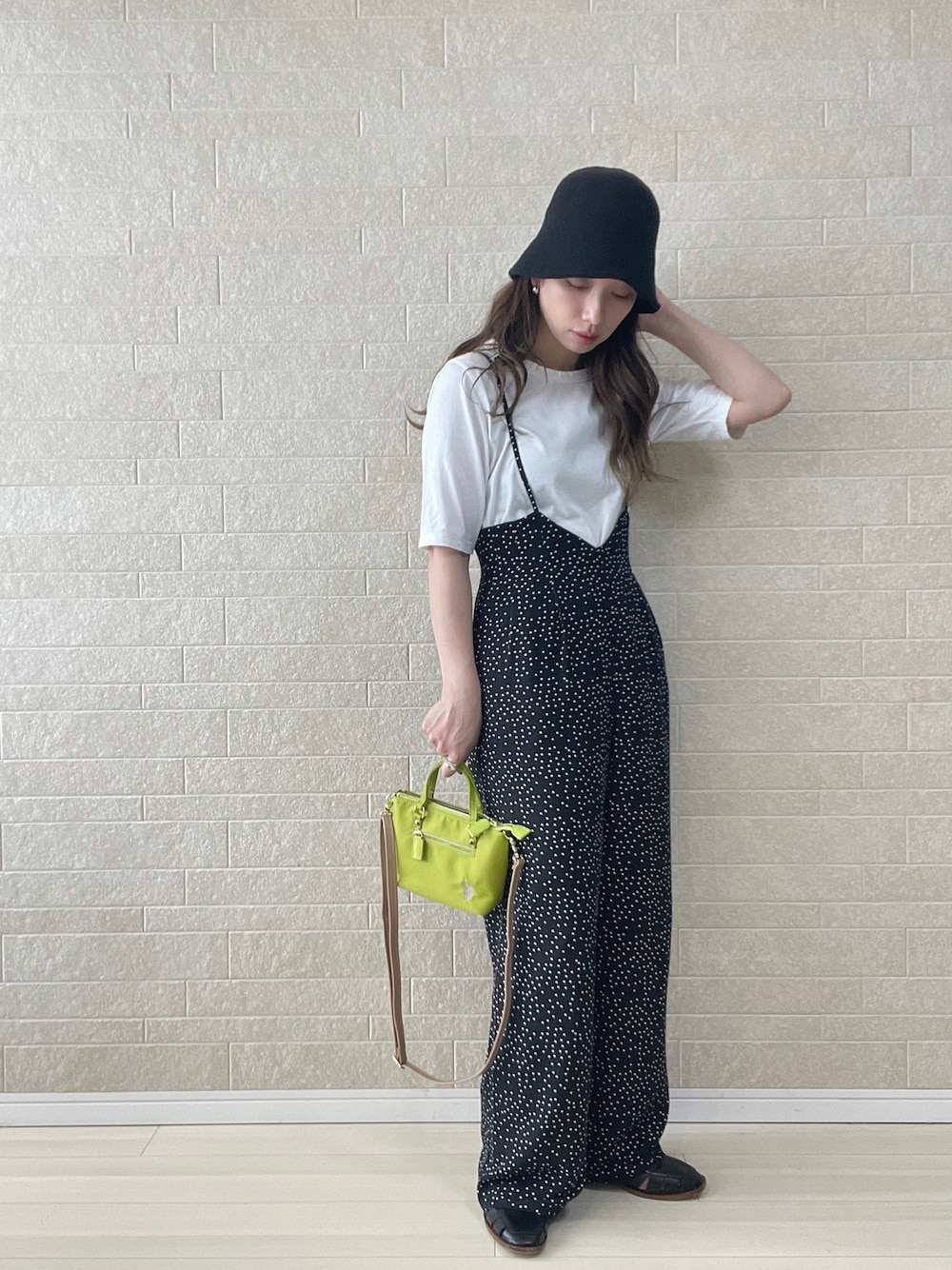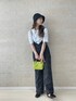 シンプルな大人モノトーンカジュアル✏︎ 無地の白Tにサロペットの王道スタイル。詰まった首元、二の腕の隠れる五分袖できれいめな印象に。 小ぶりで斜めがけもできるビタミンカラーがアクセント✔︎カジュアルなナイロン素材でコーデに抜け感がでます◎