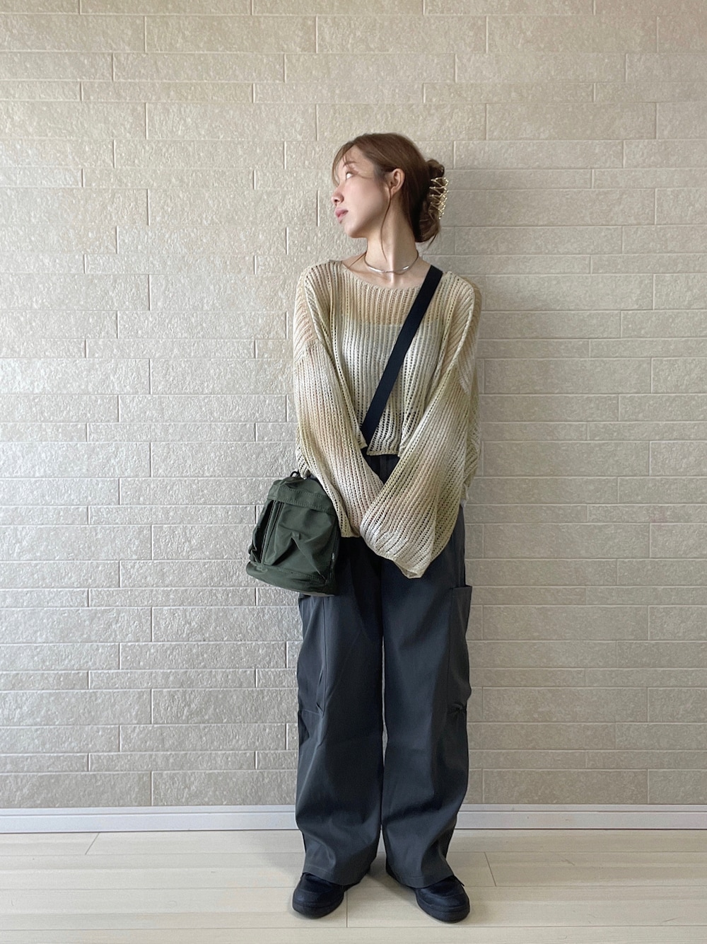 イチオシ秋プチプラコーデ🍂 見た瞬間絶対かわいいと思ったニットとカーゴパンツ*商品ページのコーデをそのまま真似しちゃいました🩶💛 【透け感・ボリューム袖・クロップド丈】の可愛いが揃ったニット✖️メンズライクなリラックスカーゴで大人女子ミリタリーの完成。 斜めがけ巾着バッグは着脱可能なハンドル付きの2way仕様です◎