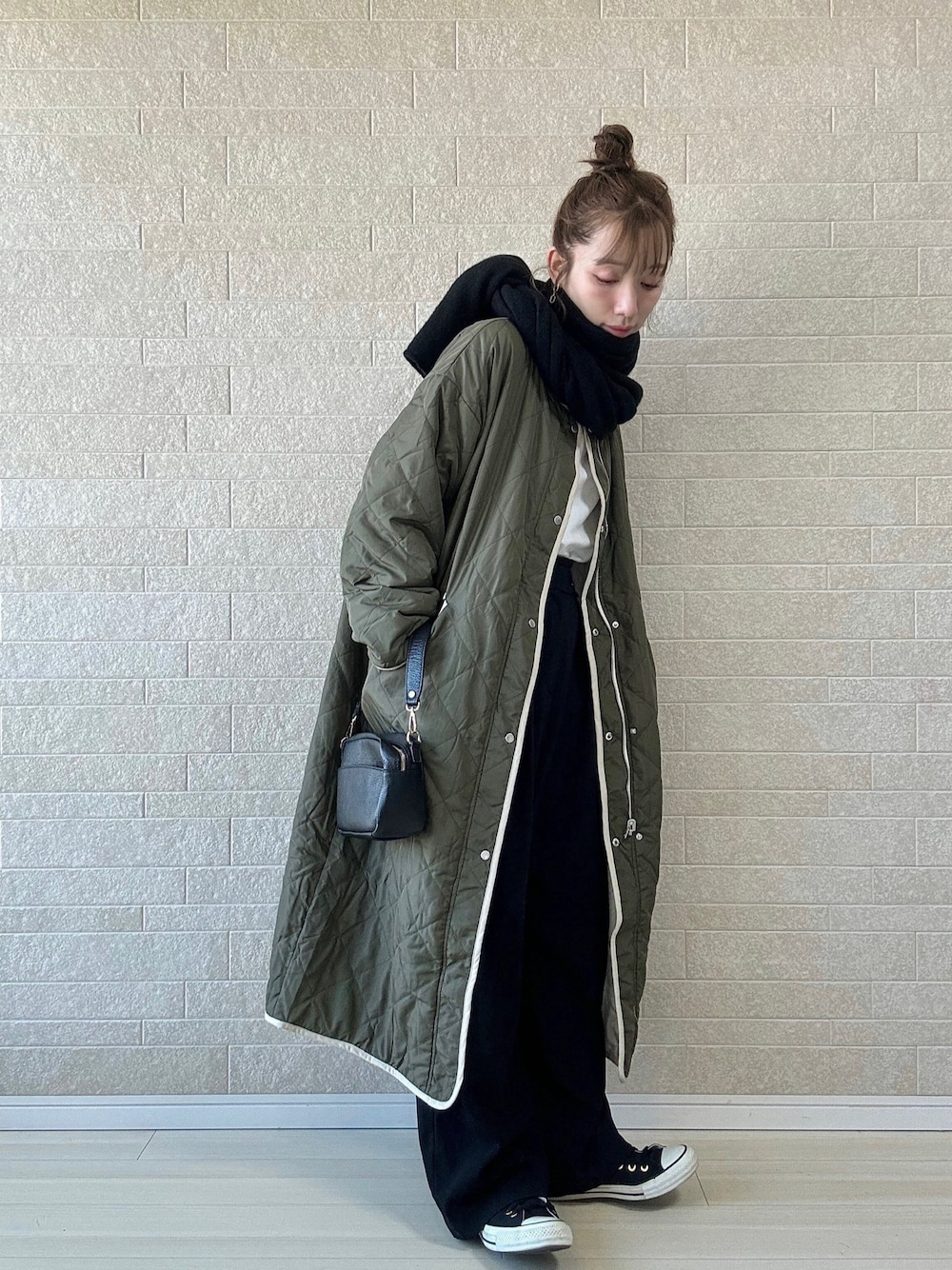 ■シンプルカジュアルコーデ USAコットンの無地ロンTとハイウェストワイドタックパンツでシンプルスタイル。リバーシブルのキルトコートはロング丈ですっきり縦長ラインに◎ 首元はぐるぐる巻いたニットストールでしっかり防寒🧶