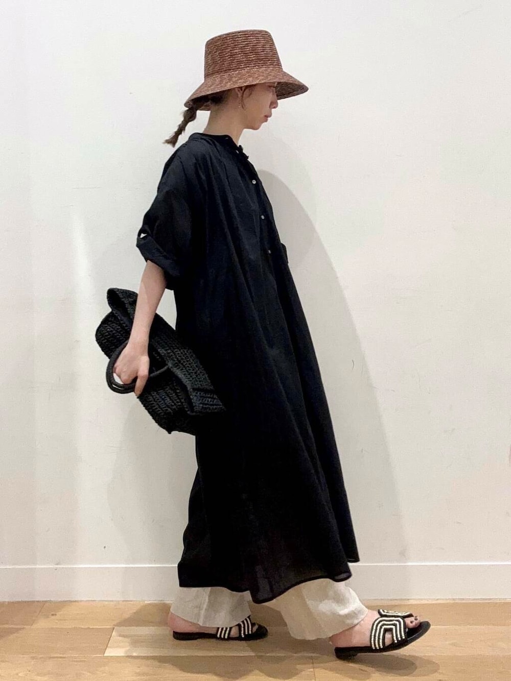 大人カラーの″涼しい服″ 頭からつま先まで夏素材でスタイリング 麦わら帽子…リボン取り外し可能、深く被れUV対策に◎落ち着いたブラウンが個人的にオススメ コットンボイルワンピース…定番ハーフスリーブワンピが長め袖に進化!ナチュラルに二の腕隠せます。 リネンイージーパンツ…程よいワイドストレートなクセのないシルエット◎レイヤードでも重くない生地感。 ビーズサンダル…ローヒールで歩きやすくアクセント使いにも最適✔︎25cmの私にはやや小さめでした。