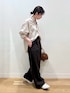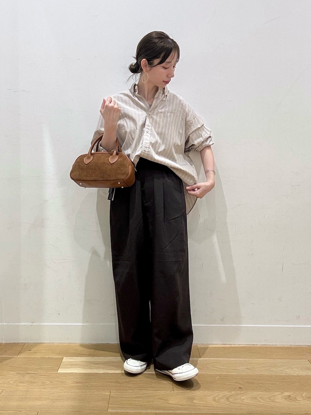ベージュのストライプシャツ+ブラウンパンツで一気に秋めいたスタイリングに✨ きれいめパンツの外しに使いやすいコンバースのスニーカー👟 バッグは秋ムード漂うレザーのボストン👜使いやすいサイズ感と横長のフォルムが愛らしいです🫶