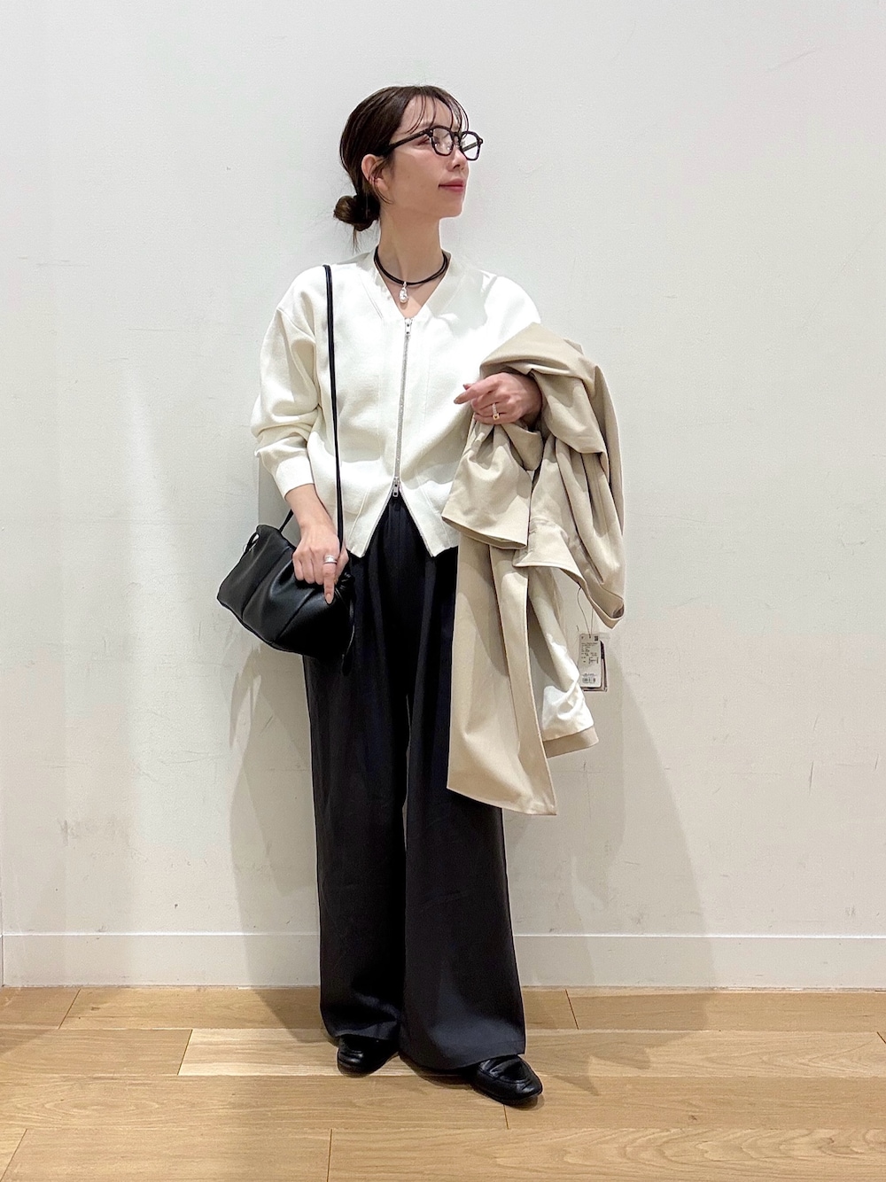 ホワイトのダブルジップカーディガンに、落ち感のあるチャコールグレーのワイドパンツ。 上下のジップを少し開けて抜け感をつくり、シンプルな配色でも間延びしないバランスに。 黒よりもやわらかく締まるチャコールが、全体を品よくまとめてくれます。 ベージュのアウターでまろやかさを足して、 クリーンだけどどこか余裕のある大人カジュアルに。