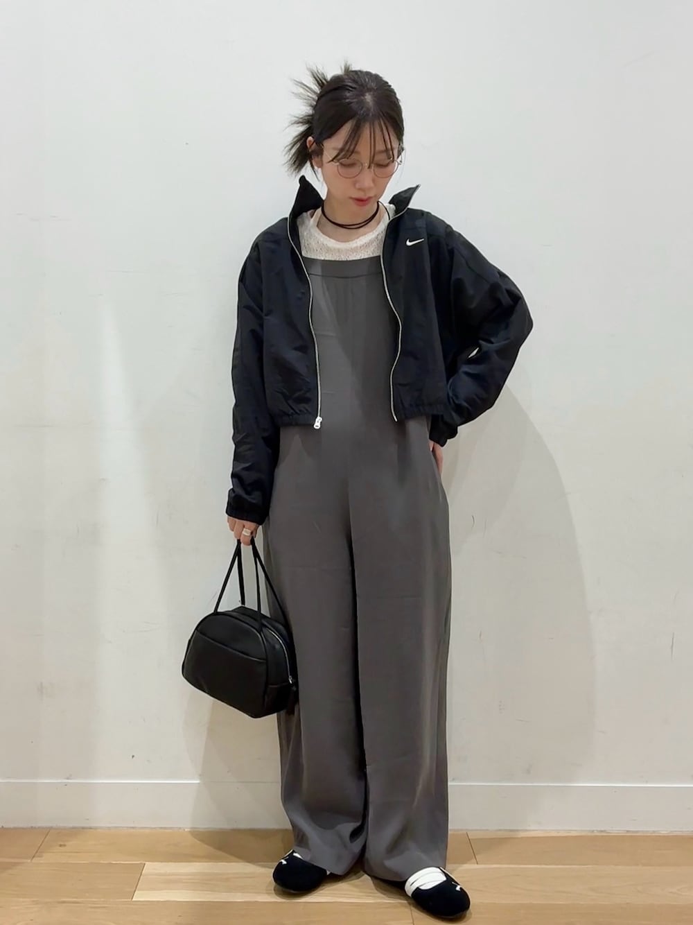 ■トロミ素材サロペットを使ったスタイリング② ナイロンブルゾン×レースのカットソー×バレエスニーカーがポイント🫧 モノトーンで色味を抑えて大人のカジュアルにまとめました✽ サロペットはS(1番長くした状態)とM(1番短くした状態)を着比べています。 個人的には長めゆったりが好みのためMを購入しましたが、サイズ感で悩みましたらWEARコメント欄よりご相談ください📝