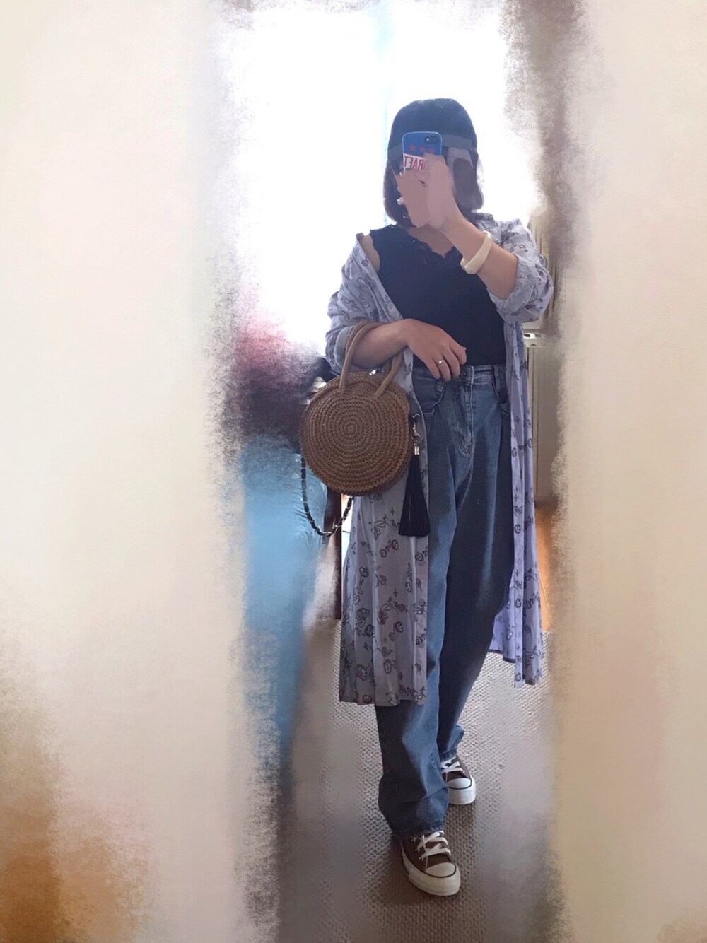 今年のヘザーのカゴバックが届いて嬉しい😊 去年のは、バケツ型で容量が多くてめっちゃ使いやすかったんです。 今年のは、サークル型で去年よりマチが薄め。 容量は去年のより少なくて、形と紐がめっちゃ可愛い! あとこのデニム、伸縮ないのに履きやすくて、形も可愛い! 低身長さんが靴履いて地面ギリギリの長さです😊